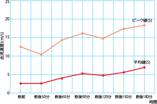 超音波ドップラー血流測定器を用い、エネワンウォーター飲用の血流速度に対する影響を実験しました。200mlコップ2杯計400mlを飲用した後に、30分単位で3時間にわたる血流速度の変化を調査したところ、飲用に伴い、血流速度が時間の経過とともに増加することが分かりました。コントロールとして水道水で同様の試験を行ったが、ほとんど変化はみられませんでした。